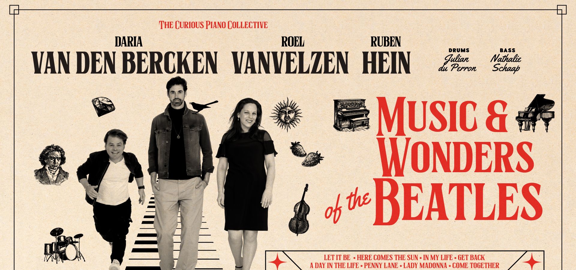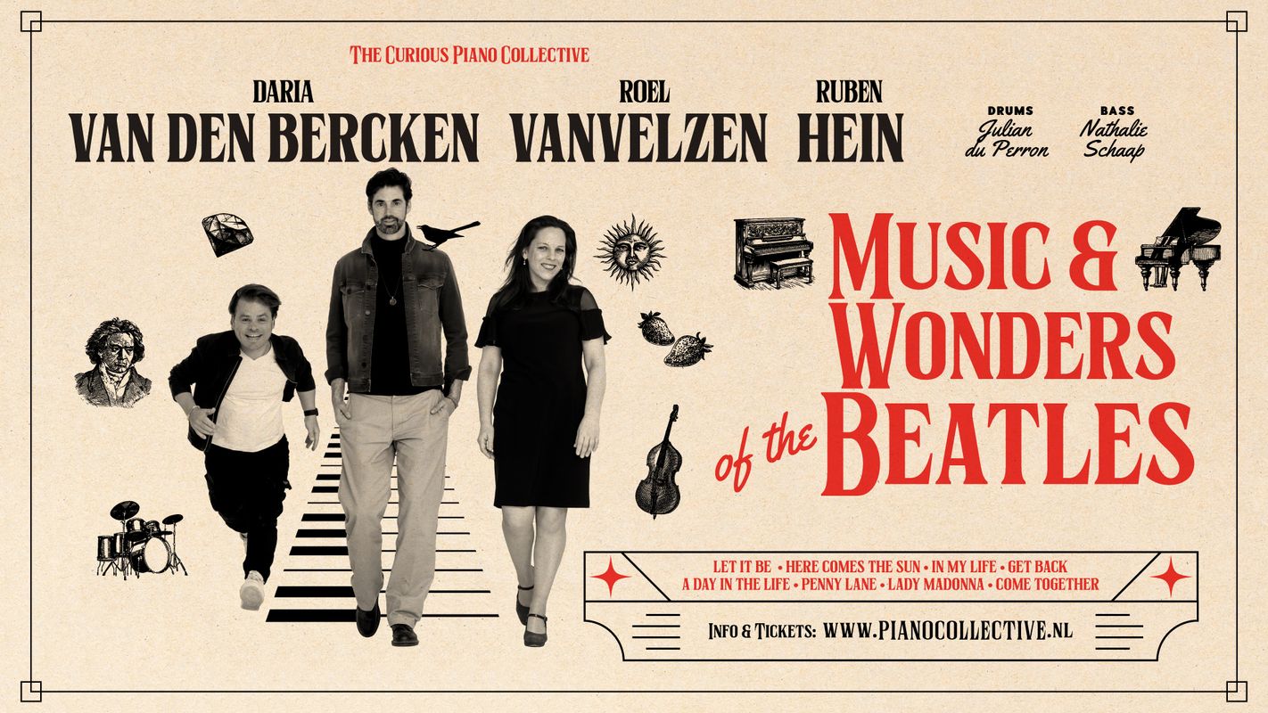 Omringd door een rijke hoeveelheid toetseninstrumenten trakteren ze de luisteraar met hun versies van grote Beatles hits, maar ook onderbelichte pareltjes van de albums Sgt. Pepper’s Lonely Hearts Club Band, The White Album en Abbey Road worden schitterend opgepoetst. Met een frisse blik verkennen ze ook de soul-, jazz-, Motown- en klassieke muziekinvloeden in The Beatles muziek. Hierbij worden ze ondersteund door drummer/ gitarist Julian du Perron en Nathalie Schaap op bas en contrabas.