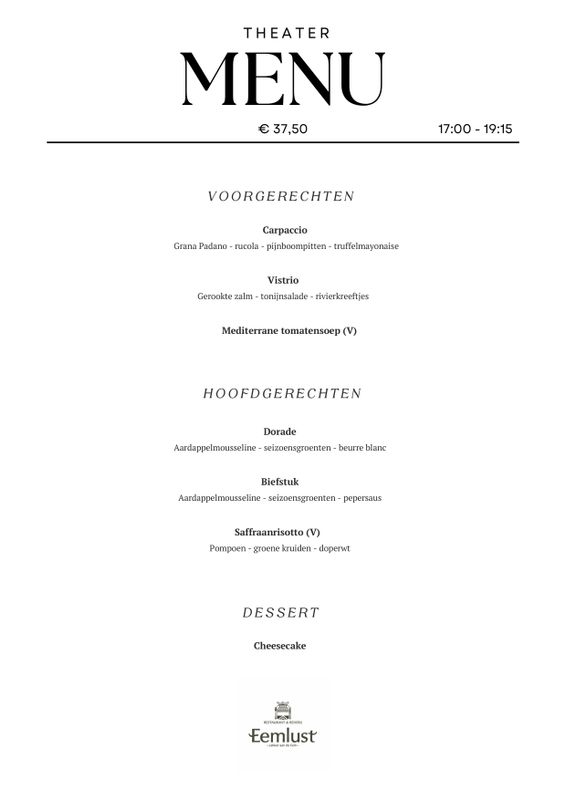 Reserveren kan rechtstreeks bij de restaurants. As je bij je reservering aangeeft dat je naar ons theater gaat, zorgen zij ervoor dat je op tijd bij de voorstelling bent.