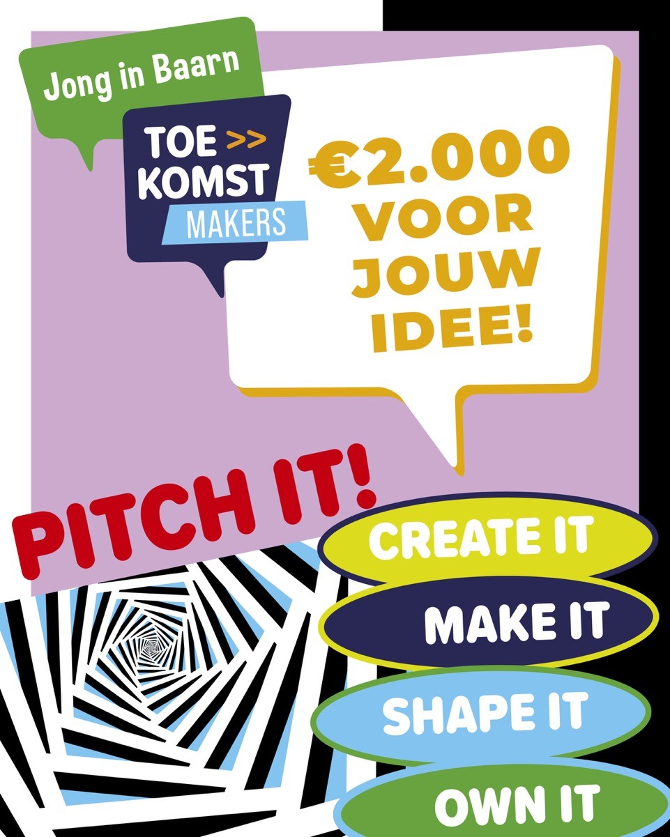 De Toekomstmakers is een initiatief van de gemeente Baarn. Jongeren krijgen de kans hun idee (alleen of met vrienden) te pitchen voor een jury en als jouw idee wordt gekozen, ontvang je niet alleen een cheque (maximaal €2.000 per project), maar ook begeleiding om je idee écht uit te voeren.