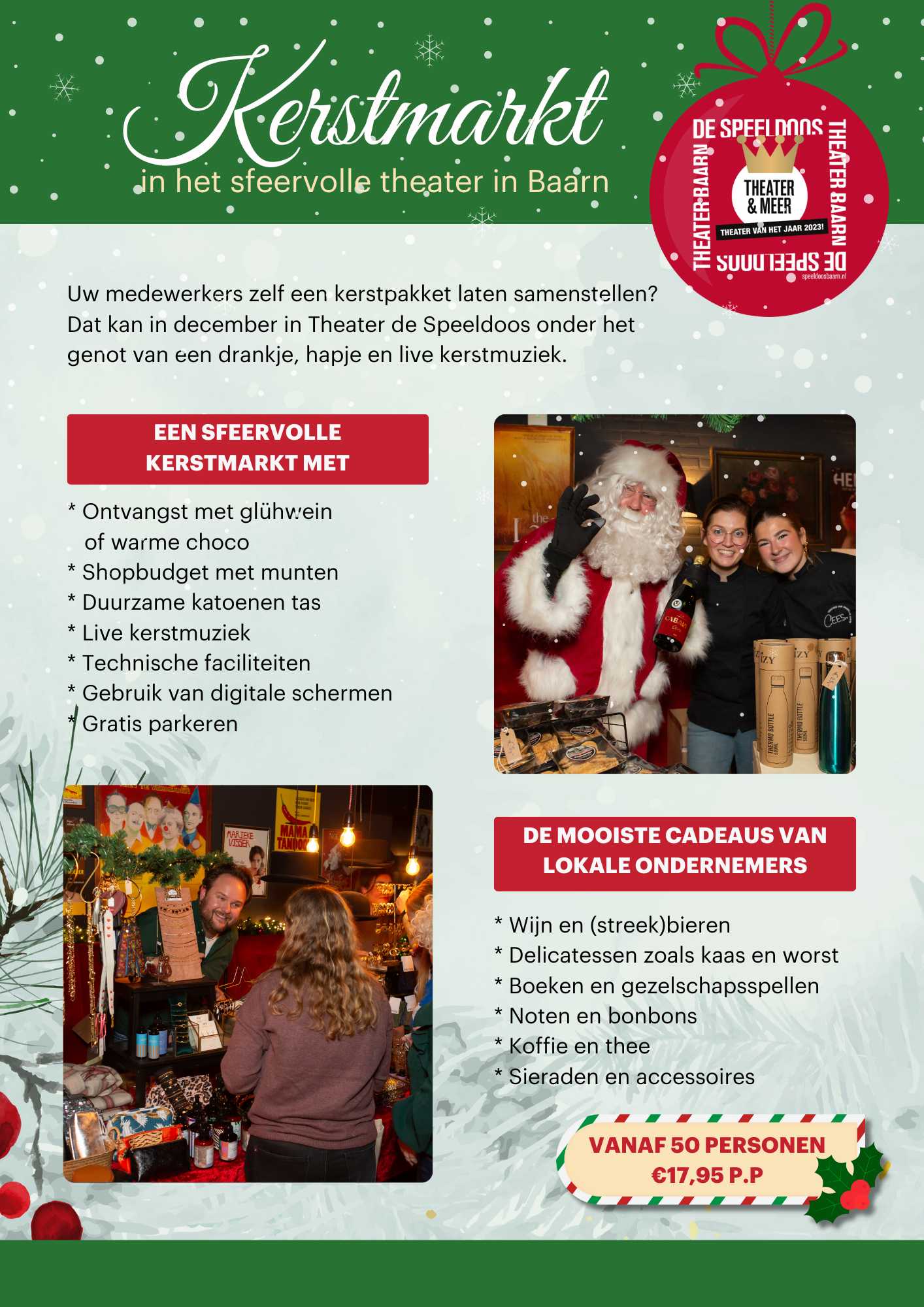 In de decembermaand kunnen medewerkers zelf een kerstpakket samenstellen in het sfeervolle theater met kraampjes van lokale ondernemers. Onder het genot van een drankje, hapje en live kerstmuziek.